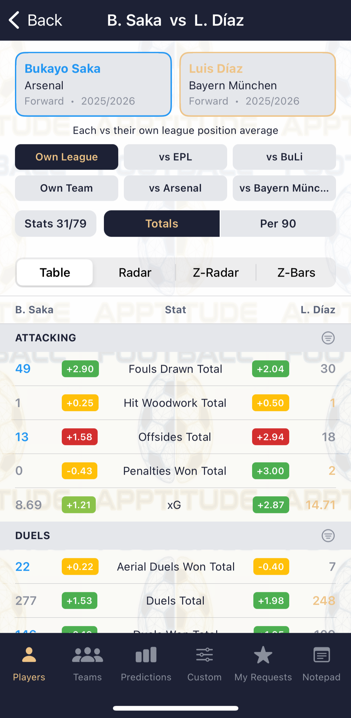 Every stat Football Apptitude carries a z-score calculated against a relevant reference population (e.g.: The league average for that season, or the team average for midfielders… among others).